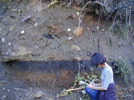 図1 新里村板橋に露出する9世紀の土石なだれ堆積物.人物の頭の位置が9世紀の地表である.その上に土石なだれ堆積物がのっている.泥基質の中にクロボク・ローム・降下軽石堆積物・溶岩塊などがパッチワーク状に配列していて,これらの土石が一群となって高速で流れてきて生じた堆積物であることがわかる.