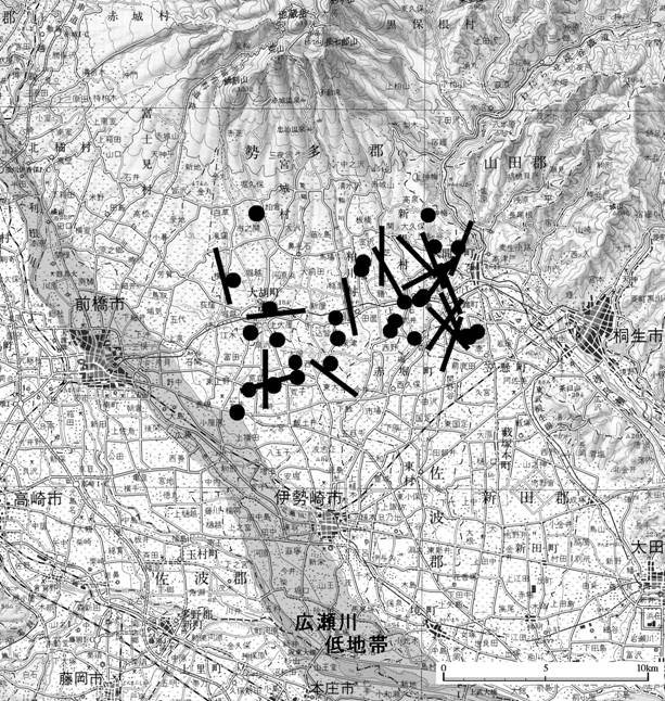 図2 新里村およびその周辺で平安時代前期の地割れが確認された遺跡.棒の伸びで地割れの方向を示す.●は能登ほか(1990)が報告した地点.国土地理院発行20万分の1地勢図「宇都宮」を使用した.