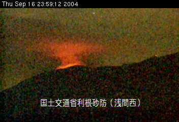 火映 「7日夜及び11日夜に、微弱な火映現象を確認した。この現象は、噴出する高温の噴煙により火孔周辺が熱せられて赤熱し、それが火口上空の噴煙や雲などに映って明るく見えたものと考えられる。なお、この火映現象は、6日に観測を開始した高感度カメラでとらえられたもので、肉眼では見ることができない弱い現象であった。」(気象庁週間火山概況9/5-9/11)