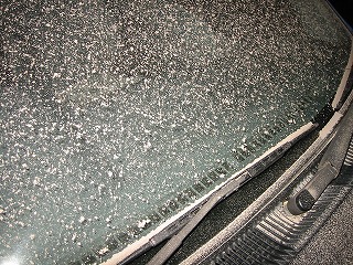 右:車の上に降り積もった灰。48g/m2。利根川を渡る国道17号に架けられた坂東橋の南500メートル。浅間山の東46キロ。