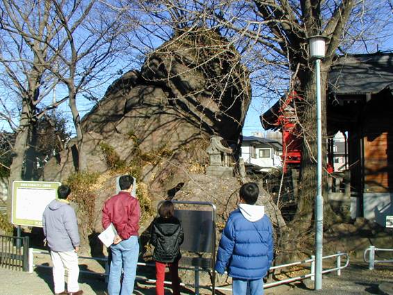 岩神の飛石。稲荷としてまつられたこの大きな赤い岩は、2万4000年前の浅間山大崩壊でここまで流れてきた。